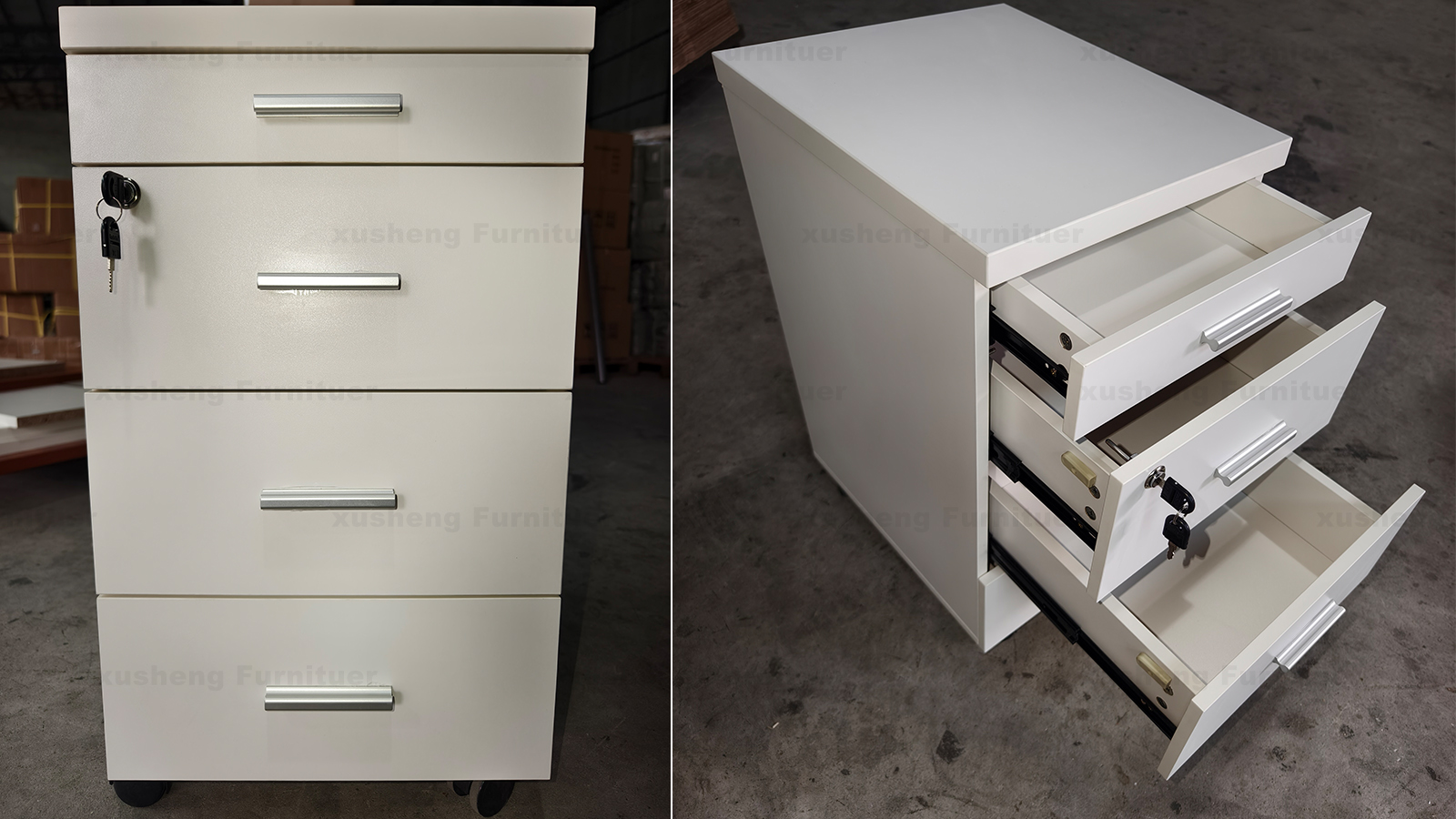 The customer described his idea of having a stationery - holding drawer based on the three - drawer mobile cabinet, but he didn't want to add more lock catches. That is, one lock would control all the drawers. So we designed a four - drawer mobile cabinet for him. The technical difficulty didn't lie in the number of drawers, but since it's a cabinet used with the office desk, its height couldn't exceed that of the office desk and shouldn't affect the normal height of other drawers. The minimum height of this drawer had to be at least higher than that of the silent guide rail, otherwise the guide rail couldn't be installed and the drawer couldn't be pulled.